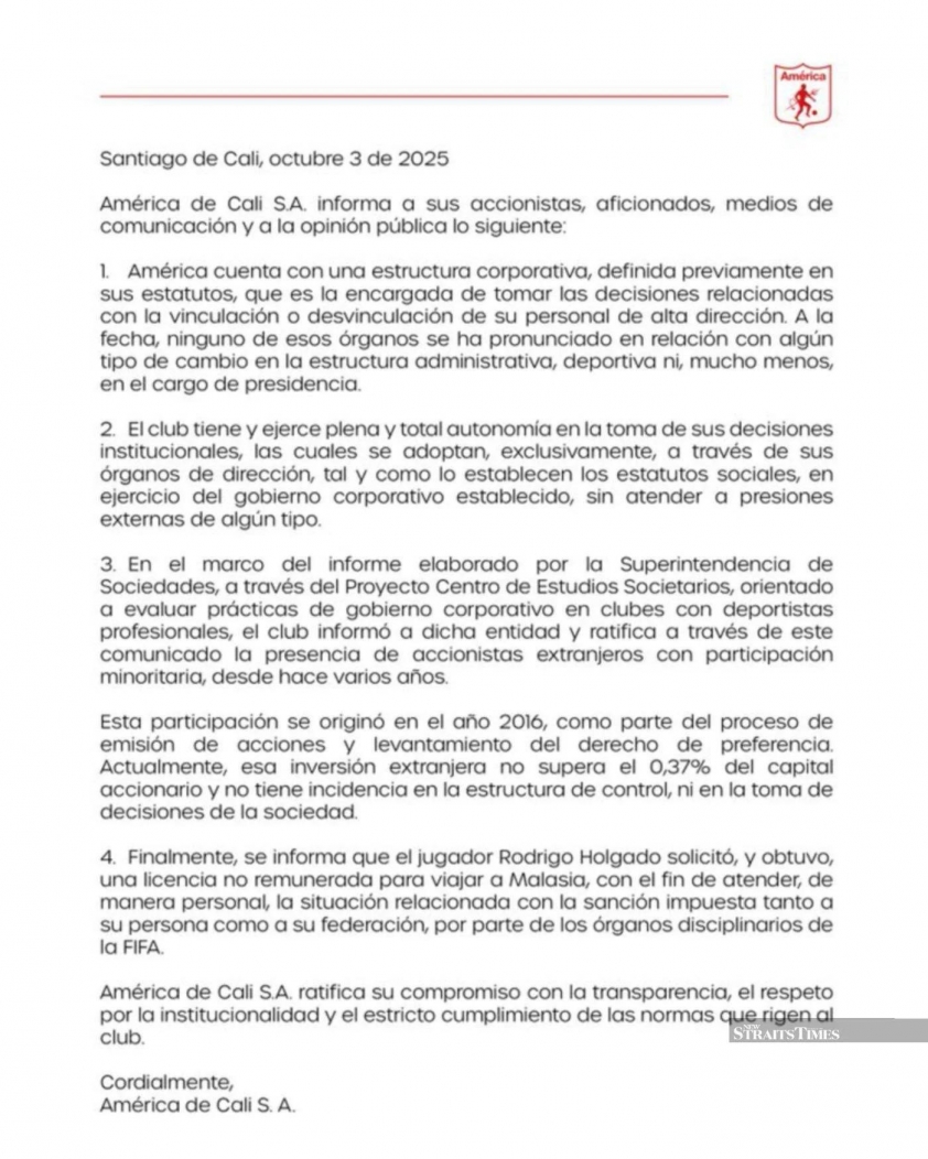 America de Cali, đội bóng đang chơi ở giải đấu Colombia, đã xác nhận trong một tuyên bố vào thứ sáu rằng Holgado đã được phép trực tiếp giải quyết các thủ tục liên quan đến phán quyết kỷ luật của FIFA. CLB này cho biết thêm rằng tiền đạo sinh ra ở Argentina, người có hợp đồng đến tháng 12 năm 2026, sẽ làm việc với LĐBĐ Malaysia (FAM) để kháng cáo quyết định này.