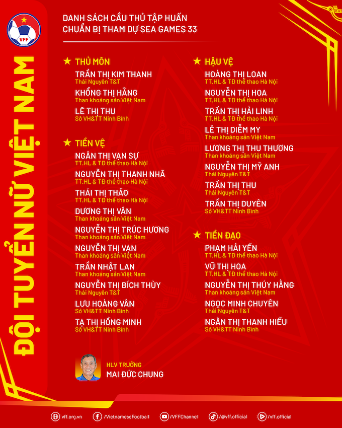 Theo đó, ĐT nữ Việt Nam sẽ tập trung từ ngày 21/10 tại Trung tâm đào tạo bóng đá trẻ Việt Nam (Hà Nội), nhằm chuẩn bị cho SEA Games 33 diễn ra tại Thái Lan vào tháng 12 tới. ĐT nữ Việt Nam vẫn do HLV Mai Đức Trung dẫn dắt với sự tập trung của 27 tuyển thủ.