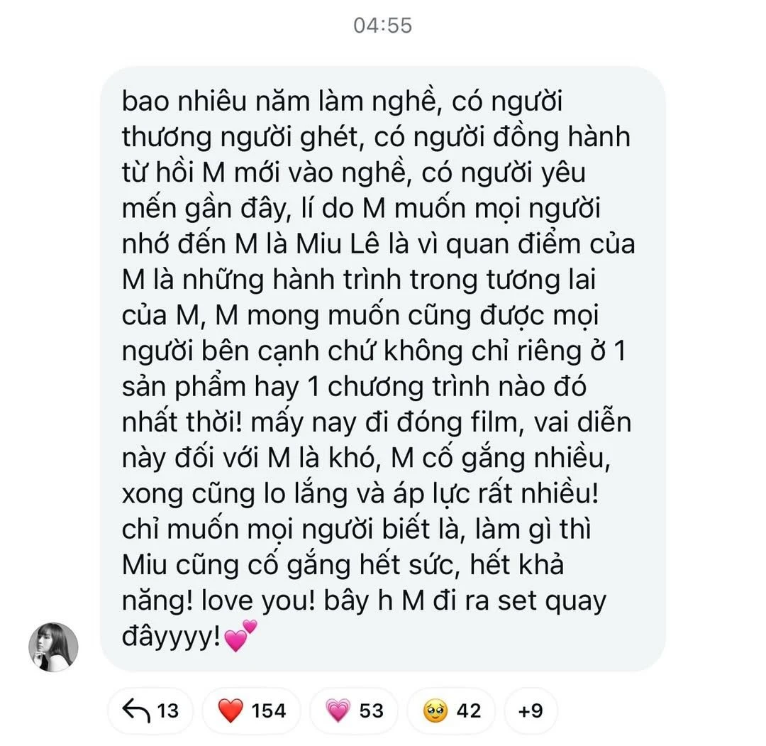 Dòng chia sẻ mới của Miu Lê được xem là lời trấn an người hâm mộ, đồng thời thể hiện thái độ cầu thị và mong muốn hướng đến sự gắn bó lâu dài với khán giả, thay vì để những tranh cãi làm lu mờ nỗ lực của cô trong thời gian qua.