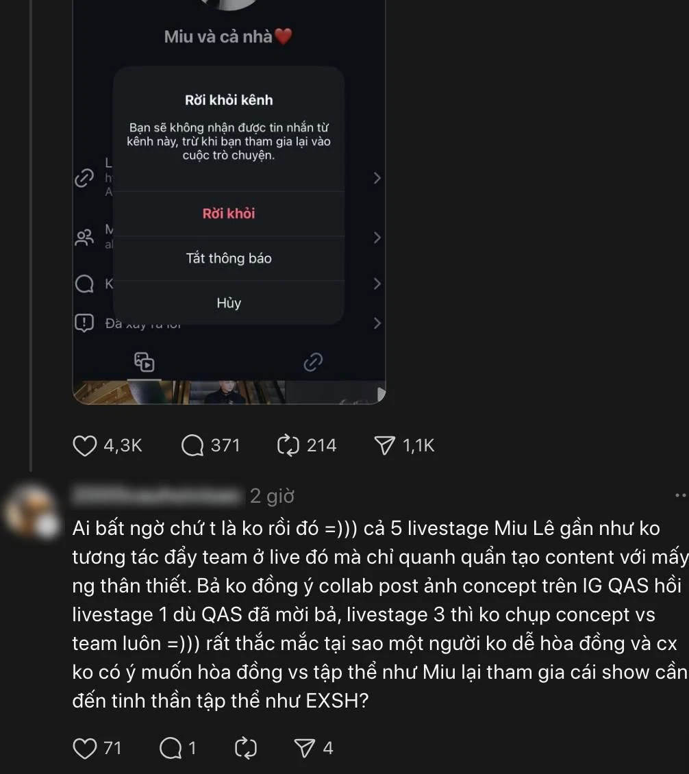 Nhiều fan của "Em xinh say hi" cũng nhắc lại những lùm xùm trong quá khứ khi Miu Lê thường xuyên có hành động tự tách biệt bản thân với tập thể. Cụ thể, một khán giả bình luận: "Cả 5 live stage Miu Lê gần như không tương tác đẩy team trên live mà chỉ quanh quẩn tạo content với một vài người mà cô ấy thân thiết. Miu Lê không đồng ý collab đăng ảnh concept trên Instagram của Quỳnh Anh Shyn hồi ở live stage 1 dù Quỳnh Anh Shyn đã mời, ở live stage 3 thì không chụp concept với team luôn, rất thắc mắc vì sao một người khó hòa đồng như Miu Lê mà lại tham gia một chương trình cần đến tinh thần tập thể như này".