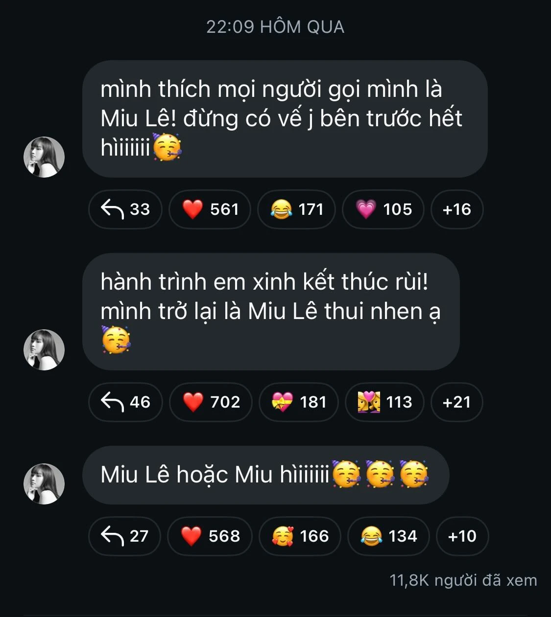 "Mình thích mọi người gọi mình là Miu Lê, đừng có vế gì phía trước hết. Hành trình em xinh kết thúc rồi, mình trở lại là Miu Lê thôi nha. Miu Lê hoặc Miu", nguyên văn tin nhắn của Miu Lê trong broadcast.